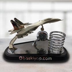 Üzerinde taşıdığı 4,5x6 cm boyutlarda metal kalemlik ve bu kalemlik yanında yer alan 3 cm çaptaki analog saatiyle fonksiyonel ve kullanışlı bir nitelik kazanan bu model uçak ofis, iş yeri, özel ve resmi daireler için tercih edilebilir. Kişiye özel model uçak maketi, hayatınıza değer katan sevdikleriniz ve anmaya değer özel günler için tercih edilebilecek nitelikte bir üründür. Görev anısı plaket bağlamında değerlendirebilir ya da askerlik mesleğini yapan sevdiklerinize armağan edebilirsiniz. Bu hediyelik uçak maketi, sevdiklerine farklı bir hediye sunmak isteyenler için oldukça ideal bir üründür. Ahşap kaidenin yan tarafına metal plaka üzerine kendi adınızı ya da sevdiklerinizin adını yazdırabilirsiniz. Süblimasyon baskı tekniği ile uzun yıllar kalıcılığından bir şey kaybetmeyen bu ürün, hatıranızı uzun yıllar yaşatacak türden kaliteye sahiptir.