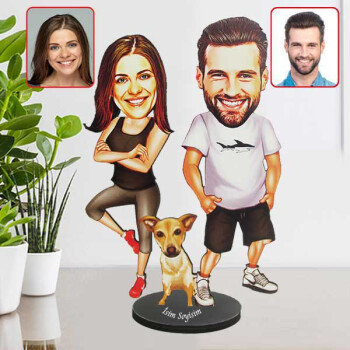 Köpek Sahibi Çift Karikatürlü Biblo, adeta ailenin bir parçası olmuş can dostlarına değer veren bireylerin tercih edebileceği bir ürün olma özelliği taşıyor. Sizin, size yol arkadaşı olan eşinizin ve bir köpek görselinin karikatürize edilmiş fotoğraflarının yer aldığı bu özel tasarım karikatür biblo, şık ve zarif tasarımının yanında sunduğu teknik detaylar ve fiziksel özelliklerle de gören herkesin beğenisini kazanacak türden bir üründür. Yaklaşık 20 cm yükseklik ve 15 cm genişlikte ölçülere sahip olan bu kişiye özel karikatür biblo, isteğinize göre 3 mm kalınlıkta pleksi ya da ahşap levha üzerine işlenebilmektedir. Bununla birlikte göndereceğiniz fotoğraflar ve ona bağlı olarak hazırlanan tasarımlarda ufak boyutlu ve tolere edilebilir ölçüde boyut farklılıkları yaşanabilmektedir.