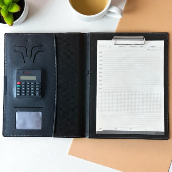 Kişiye Özel Baskılı Hesap Makineli Gri Sekreterlik, bireysel kullanımların yanı sıra kurumsal ya da promosyon amaçlı kullanımlar için de tercih edilebilecek oldukça şık bir üründür. Estetik tasarım, işlevsel kullanım, ergonomik dizayn ve ekonomik fiyatı bir arada sunan bu kişiye özel kapaklı sekreterlik, siyah renkteki suni deri kaplamasıyla oldukça prestij sahibi bir görünüm sergiler. Kapaklı tasarımın ön iç yüzünde farklı ebatlarda iç kullanım cepleri, kartvizitlik gözleri, kalem tutturma aparatı ve işlevsel bir hesap makinesi bulunur. Arka kapağın iç yüzünde ise 95 mm paslanmaz sıkıştırma aparatı bulunan bir evrak tutucu yer alır. Bu logolu sekreterlik, A4 boyutlu evraklarınız için ideal bir kullanım şekli sunar.