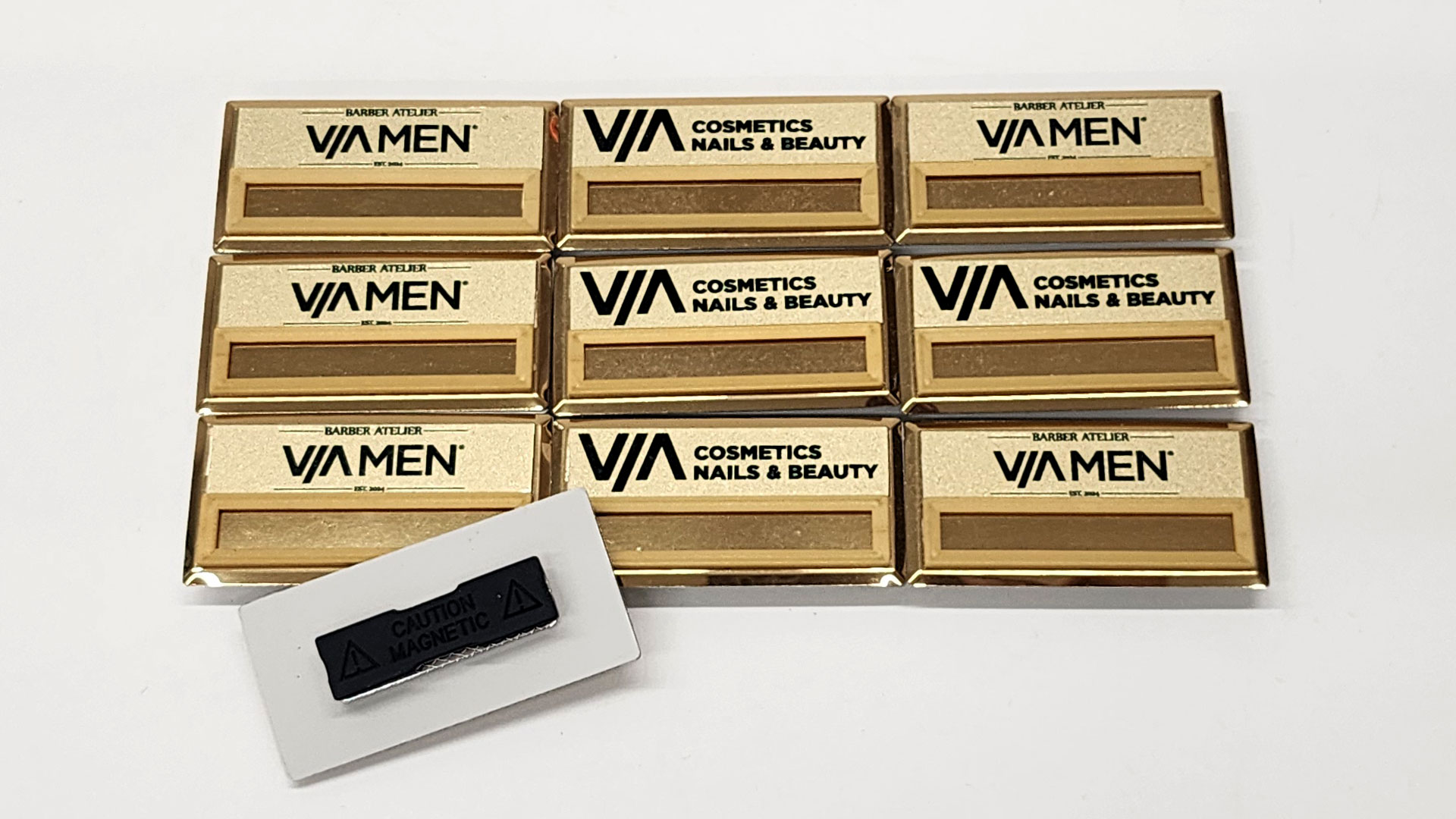 Paslanmaz metal alüminyum malzemeden üretilen bu mıknatıslı isimlik, 36x75 mm boyutlara sahiptir. Dikdörtgen şekildeki bu metal yaka kartı, sivri kenar ve köşelerden arındırılmış oval niteliğe sahip köşeleri sayesinde çok daha estetik ve güvenli bir forma büründürülmüştür. Parlak altın tondaki görünümüyle oldukça dekoratif ve şık bir görünüm sergileyen bu personel yaka kartı, CMYK süblimasyon baskı ile istenilen renkte logo ve metinlere ev sahipliği yapabilir niteliktedir. Dilerseniz 9x58 mm pencere alanına kendi oluşturduğunuz çıktıları yerleştirebilir ve bu alana kendi font ve karakterini belirlediğiniz kâğıt çıktı isimlikleri de yerleştirebilirsiniz.