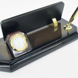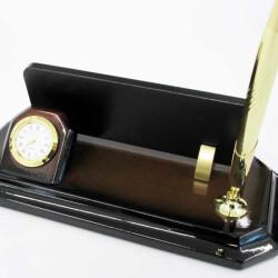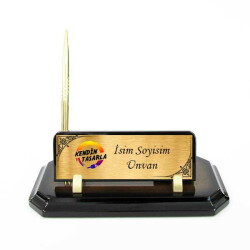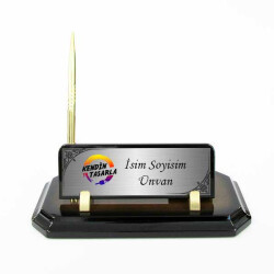 Yan kısmındaki analog saati ve diğer yanda bulunan gümüş renkteki kalem yuvasıyla oldukça işlevseldir. Beraberinde gelen metal gövdeli bir tükenmez kalem ile evraklarınıza arşiv kalitesinde imzalar atabilirsiniz. Bu tasarım masa isimliği, 6 x 17 cm isimlik levhasına sahiptir. Alüminyum malzeme üzerine işlediğimiz isimlik plakalarını bu alan üzerine sabitliyor ve ürünü sizlere gönderiyoruz. Üstelik alüminyum plaka için sizlere altın ve gümüş renk seçeneklerini de sunuyoruz. Yeni iş hediyesi veya terfi hediyesi bağlamında düşünebileceğiniz bu promosyon masa isimliği için tek yapmanız gereken, sipariş panelinden unvan ve isim alanını doldurmanız ve baskı alanı rengi seçiminde bulunmanızdır. Bundan sonrası alanında uzman kadromuzun ellerinde ve modern cihazlarımızın kucağında şekillenecektir.