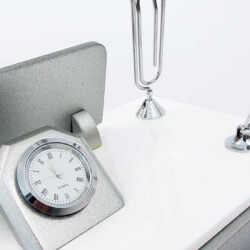15x28 cm boyutlara sahip olan tabanı üzerinde iki adet kalem yuvası yer alır. Beraberinde gelen metal gövdeli iki adet tükenmez kalemiyle oldukça şık ve işlevsel bir kullanım sergileyen bu kişiye özel masa isimliği, orta kısmında bulunan analog saatiyle de ön plana çıkıyor. Ataş şeklindeki metal not tutacağı sayesinde üzerine unutmamanız gereken notları sabitleyebilir ve bu sayede masa isimliği setinizi çok daha kullanışlı hale getirebilirsiniz. 6x16,5 cm isimlik levhası üzerine modern cihazlarımız ile hazırlanan alüminyum isimlikler yapıştırılarak size özel hale gelen bu promosyon masa isimliği için tek yapmanız gereken sipariş panelinden isim ve unvan bilgilerini belirtmek olacaktır. Ayrıca sizlere alüminyum isimlik plakası için altın ve gümüş renk seçeneklerini de sunuyoruz. Süblimasyon baskı tekniğiyle ısı, ışık, nem ve UV ışınlara karşı direnç sağlayan bu masa isimliği modeli, üzerindeki metin kalitesini yıllar boyunca korur.