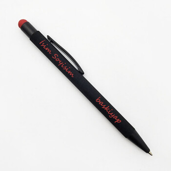Bu kalemin önde gelen en büyük özelliği, tepe kısmında bulunan silikon aparatı sayesinde kişiye özel dokunmatik kalem niteliğine bürünmesidir. Touchpen kalemler, dokunmatik ekrana sahip telefon, tablet, bilgisayar ve daha pek çok cihaz için çok daha etkili bir kullanım şekli sunar. Daha pratik bir kullanım sunan bu ürünler sayesinde elinizde eldiven varken ya da zorlu çalışma ortamlarındayken isme özel touchpen kaleminiz sayesinde dokunmatik ekranlı cihazlarınızı çok daha verimli kullanabilirsiniz. Ürününüzü size özel hale getirirken lazer kazıma yöntemini kullanıyoruz. Lazer ışınlar yardımıyla mat siyah boya tabakasını kaldırıyor ve alt yüzeyde kalan kırmızı rengi açığa çıkarıyoruz. Lazer baskı kalemin silikon kısmıyla aynı tonda gözüken tasarımlarınız, siyah gövde ile birlikte oldukça hoş bir kombinasyon oluşturur ve kaleminizi estetik olarak zirveye taşır.