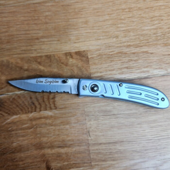 440C paslanmaz metal çelikten imal bıçağa sahip olan bu lazer kazıma çakı, yüksek karbon içeren hammaddesi sayesinde ısı, ışık, nem, kimyasallar gibi olumsuz etmenlere karşı dirençlidir. Korozyona karşı dirençli katlanabilir çakı ürününüz, sivri uç ve testere dişleriyle oldukça işlevseldir. Bu yüzden her alanda sizlere yardımcı olur. Lazer kazıma yöntemiyle ürün üzerine dilediğiniz metin, logo veya vektörel tasarımı işleyebiliyoruz.