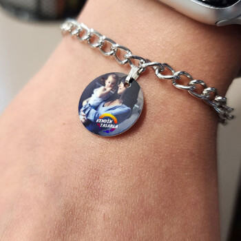 20 mm çapta dairesel formda ve 1 mm kalınlığa sahip paslanmaz çelik levha üzerine dilediğiniz her türde metin, logo, vektörel tasarım, resim ve fotoğrafın işlenebileceği bu kendin tasarla bileklik, CMYK süblimasyon baskı yöntemiyle işleniyor. Sevdiklerinizin hatırasını uzun yıllar üzerinde taşıyacak olan bu isme özel bileklik, 18 cm açık uzunluğa sahip bir zincirle birlikte gelir. Paslanma, kararma, oksitlenme gibi olumsuz durumlara karşı oldukça dirençli olan bu ürün, klipsli kilit mekanizmasıyla da güvenli bir kullanım sunuyor.