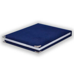 Kapalı durumdayken 14x17x2,5 cm boyutlara sahip olan bu albüm plaket, açıldığı zaman yaklaşık olarak 14x17x16,5 cm ölçülerdedir. İç yüzeyindeki alana yerleştirilecek olan 9x12 cm boyutlardaki metal baskı alanına CMYK süblimasyon baskı yöntemiyle dilediğiniz tasarımı işleyebiliyoruz. Plaka üzerine isim, firma, hizmet tarih detayları ve logolar işlenebilmektedir. Lacivert kadife kaplama şık görünümüyle ön plana çıkan bu lacivert plaket, gümüş renkte metal köşebentler ve simli gümüş kurdele detayıyla da göz doldurur.