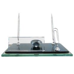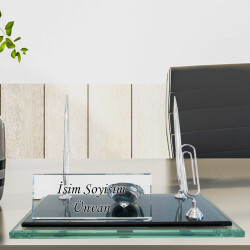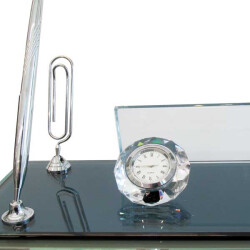 15x27,5 cm boyutlara sahip olan bu kristal masa isimliği, çift kat camdan imal edilmiştir. Yaklaşık olarak 1,5 cm kalınlıktadır ve kırılmaya karşı oldukça dirençlidir. Tabandaki cam kısmı su yeşili şeffaf renktedir. Üst yüzey ise şeffaf mavi rengiyle oldukça dekoratif bir görünüme sahiptir. Keskin kenar ve köşeleri törpülenerek çok daha estetik ve güvenli hale getirilen bu çift kalemli masa isimliği, beraberinde iki adet gümüş renkte tükenmez kalem ile sizlere ulaştırılır. Orta kısmında elmas desen çerçeveli analog saatiyle estetik olduğu kadar işlevsel bir kullanım da sunar. Ataç şeklindeki metal not tutacağı sayesinde unutmamanız gereken notları sürekli göz önünde bulundurabilirsiniz.