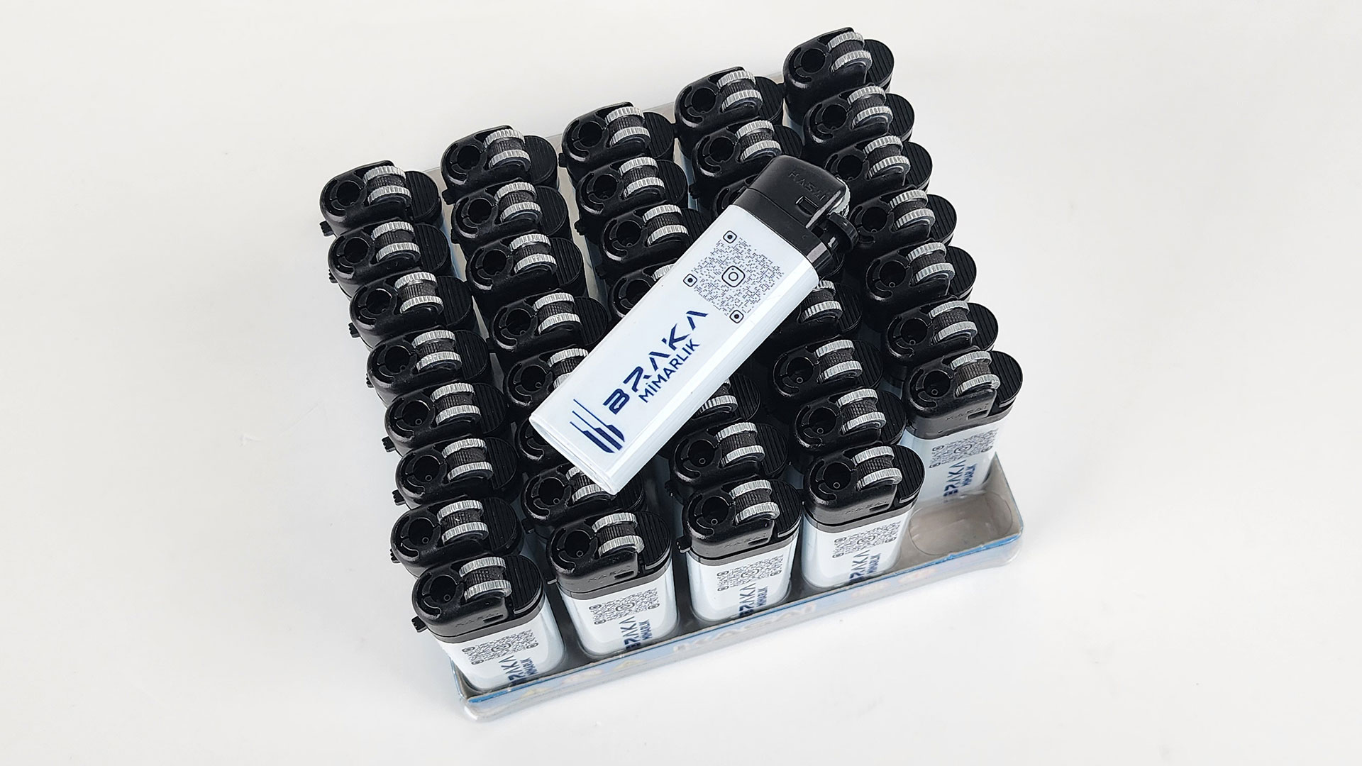 Geniş ürün yelpazesine her geçen gün yeni ve kullanışlı ürünler ekleyen baskiyap.com, etkili bir reklam ürünü olan bu baskılı promosyon çakmak ürününü sizlere sunuyor. Beyaz renkte ABS plastik kasa ve metal aksama sahip bu çakmak, 8x2,3 cm ebatlardadır. 1,5x6 cm ölçülerdeki baskı alanına metin, logo, resim gibi dilediğiniz tüm tasarımları renkli UV baskı ile işletebilmeniz mümkündür. Manyetolu kolay ateşlenebilen mekanizmaya sahip bu toptan baskılı çakmak ürünün, gaz ayarı düğmesi ve tekrar dolum sağlayan siboplu yapısı bulunur. Üzerindeki baskıyı tamamen sizin tasarlamanıza imkân sunan bu çakmak ürününe isteğe göre tek veya çift taraflı baskı yapılabilir.