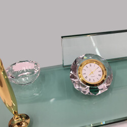 Orta kısımda bulunan elmas desen çerçeveli analog saati ve kristal desen yuvasıyla oldukça şık ve işlevsel bir kullanım sunar. Kristal desen yuva içine raptiye, iğne ve ataş gibi küçük ofis gereçlerinizi koyabilirsiniz. Beraberinde gelen altın renkte metal gövdeye sahip iki adet tükenmez kalem ile zenginleştirilen bu çift kalemli masa isimliği, prestij sahibi çalışma alanları hazırlamanıza yardımcı olur. 6 x 15 cm boyutlardaki cam isimlik üzerine folyo kesim yöntemiyle özelleştirme işlemi yapılır. Üstelik folyo etiket rengini sipariş panelinden seçebilirsiniz. Bunun için sizlere gümüş, altın, beyaz ve siyah folyo renk seçenekleri sunulur.